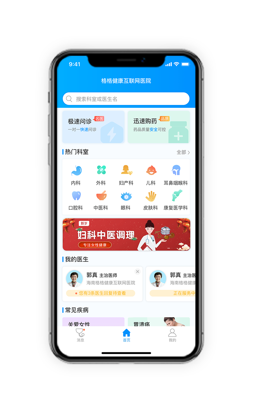 格格健康APP是一款针对复诊用户的健康管理软件。帮助患者与医生搭建在线问诊沟通平台,并打通零售配送,实现送药上门,为患者提供一站式贴心服务。